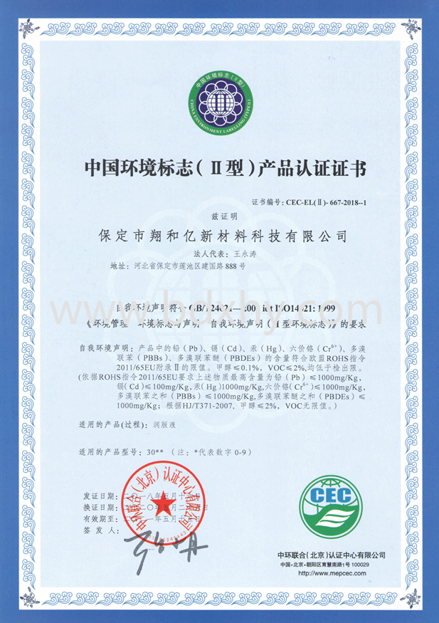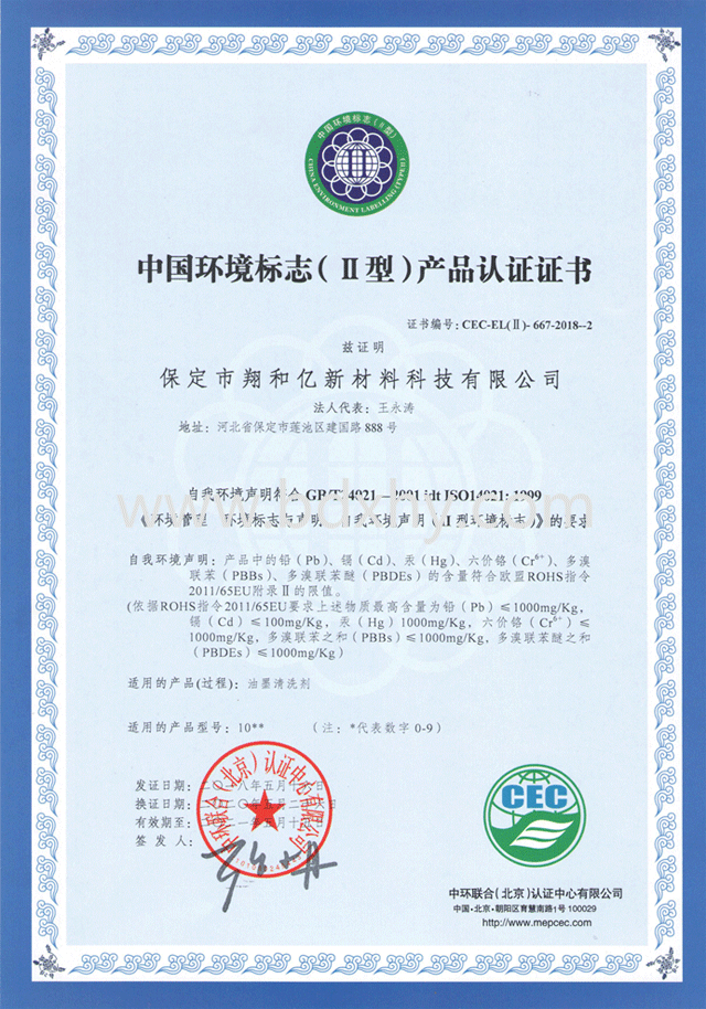 我公司于2018年5月通過中環(huán)聯合(北京)認證中心對我公司嚴格審查,認證通過并獲得《中國環(huán)境標志(II型)產品認證證書》—認證產品名稱:潤版液,油墨清洗劑。